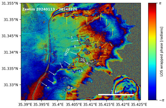 An interferogram of the Ze’elim fan spanning 44 days in early 2024, showing subsidence lineaments that are interpreted as surface manifestations of subsurface dissolution channels. The two acquisition times are 13 January 2024 and 26 February 2024. WZSL, EZSL, and NZSL stand for western, eastern, and northern Ze’elim subsidence lineaments, shown by white, orange, and yellow arrows, respectively. Gully numbers are marked in white (after [3]).