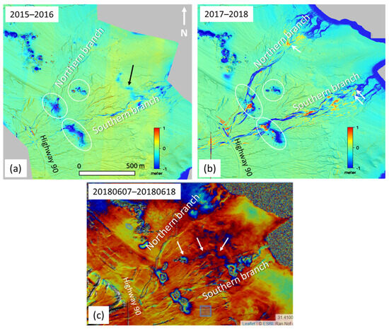About 200 m upstream of Highway 90, the Hever riverbed splits into a northern, NE-flowing branch and a southern, ENE-flowing branch (Figure 1b). The annual changes within this fluvial system include streambed incision, sinkhole-related subsidence, and gravel deposition along the streambeds and within streambed sinkholes (Figure 11). About 400 m east of the road, two clusters of sinkholes and subsidence cross the two stream branches (white ellipses in Figure 11). The northern branch sinkholes are concentrated mainly at the SE margins of the streambed (Figure 11 and Figure 12), allowing a significant fraction of the floodwater to continue downstream, either along parallel braided stream channels (blue arrows in Figure 12) or across the sinkholes. The southern branch sinkholes developed across the entire width of the streambed, generating a ~100 m wide NW-SE trending shallow depression (Figure 11). Here, floodwater temporarily accumulates and recharges, while overflow continues further downstream. Some 600–800 m downstream of these two sinkhole clusters, both stream branches show additional zones of subsidence with shallow (<2 m deep) sinkholes (Figure 11c).
