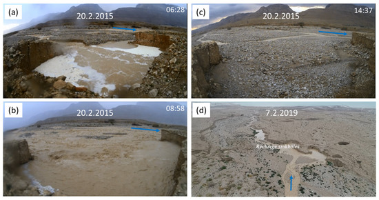 (a–c) TLC photos showing recharge of floodwater at sinkholes in the northern branch of Hever fan during the 20 February 2015 flood. Blue arrows mark the braided streambed flow direction. Note the water overflow and the filling of the sinkhole with gravel at the final hours of the flood (panels (b) and (c), respectively). (d) Drone picture of 7 February 2019 floodwater drained into recharge sinkholes along the northern Hever branch with overflowing water continuing downstream.