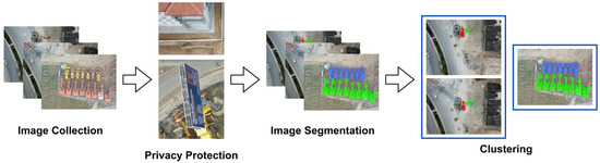 The development of an extensive and varied image dataset, AIDCON, spanned a long period. Aerial images were gathered during the construction monitoring processes and organized for use in this dataset creation. The dataset development procedure can be categorized into four main parts: image collection, privacy protection, image segmentation, and clustering (Figure 1).