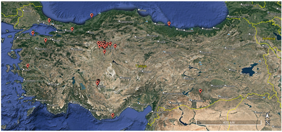 Over the eight years spanning from 2015 to 2023, aerial images were collected from 25 distinct locations within the borders of Türkiye, as illustrated in Figure 2. The altitudes of the images range from 10 to 150 m. The earlier images were obtained for the purpose of construction monitoring, productivity measurement, and quality control research studies for construction projects by the authors. A subset of this image archive, including construction machinery, was identified and selected for the AIDCON dataset. In addition to the existing images, supplementary images were collected to account for less frequently encountered construction machinery.
