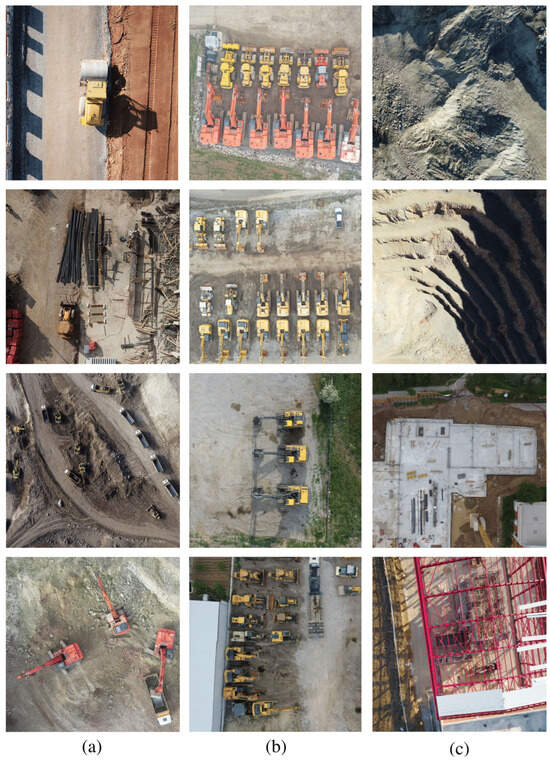 Most of the locations from which data were gathered are construction job sites such as excavation fields, steel structures, reinforced concrete structures, and transportation projects (Figure 4a). Before being transported to the job sites, construction machines are generally parked in the parking areas for not being assigned to job sites or maintenance purposes. A diverse range of machines was gathered in the same place, which makes this place a perfect spot for data collection. Therefore, UAV footage over parking areas was deployed, and the AIDCON dataset was enlarged by taking parked construction machines (Figure 4b). The machines’ various poses and scales for construction job sites and parking areas have been achieved. In addition, a small portion of images from construction job sites that do not include any construction machines were added to the image set to represent negative samples (Figure 4c). Incorporating negative samples in the dataset can help deep learning algorithms achieve higher accuracy by improving their ability to distinguish between relevant and irrelevant patterns in the data and by increasing their generalizability to new and unseen data.