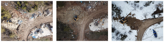 During such a long data collection period, construction sites’ weather conditions change from summer to winter (Figure 5). Therefore, the dataset was carefully curated to include various images captured under different weather. Sunny and snowy images were included in the dataset to enable the model to recognize construction machines under varying environmental conditions. Additionally, all images were captured during daytime hours to ensure consistency across the dataset. The image format selected for the dataset was JPG, as it is a commonly used and widely accepted format. Furthermore, WGS-84 coordinates, specifically the latitude and longitude of the UAV, were embedded in the images’ metadata to facilitate their location identification, thereby enabling the grouping of images taken on the same construction sites.