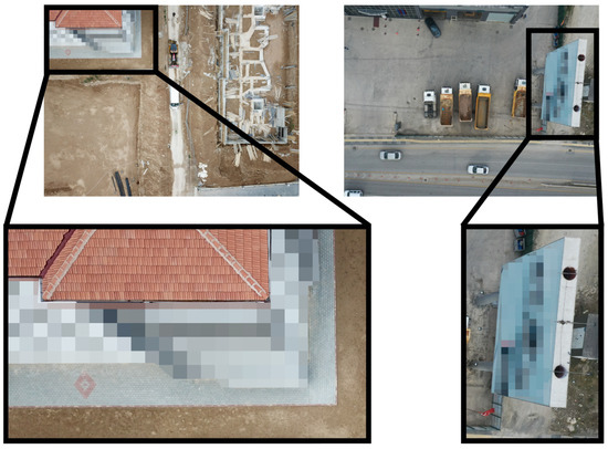 The privacy of individuals and corporate entities was considered during the dataset’s development. Building windows and the faces of individuals who might have been captured looking up at the UAV camera were intentionally blurred to prevent potential privacy concerns. Additionally, the names, logos, and slogans of companies visible in the images were acknowledged and appropriately covered to avoid any unintended consequences of privacy violations. This approach ensured that the dataset complied with ethical considerations and was developed following best practices in data privacy (Figure 6).