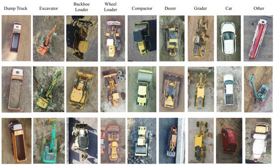Considering the construction machine datasets in the literature and field expert opinions, construction machine categories were selected. The chosen construction machine categories are dump truck, excavator, backhoe loader, wheel loader, compactor, dozer, and grader (Figure 7). Machines with fewer occurrences, like asphalt paving machines and drilling machines, were grouped and named the “other” category. Cars frequently appeared inside or near the construction area in the aerial images; therefore, they were labeled and grouped separately.