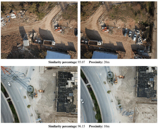 When previous studies were reviewed, image shots of the same scenes were not grouped separately and were placed in train-test splits. Similar, even duplicate images, were found on the construction datasets in the literature. Because of the similar images, although overall accuracy increases, overlapping images between training and test sets cause memorization problems. The trained model should be tested with unseen images during training. In the study of Xiao and Kang [29], the duplication removal procedure was completed manually. They noted that the possibility of automating the removal of duplicated images by utilizing algorithms that can measure image similarity would be explored. In our proposed AIDCON dataset, there are also overlapping images. Although view angles differ, some machines have included more than one image. Therefore, it is necessary to identify and group them to organize training and test splits appropriately. From this perspective, images were clustered using image similarity and proximity metrics. Example images with similarity and proximity metrics are given in Figure 9.