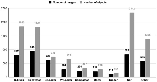Number of objects and number of images for each type of construction machine.