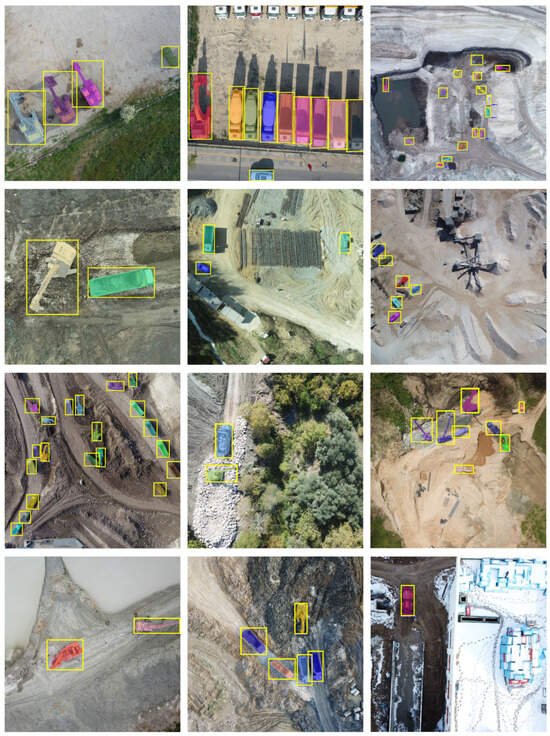 Current construction-related datasets have images taken using fixed or mobile cameras taken on a ground level. Although many applications are based on UAV imagery, there is no large-scale and open aerial image set. This study’s main contribution to the literature is the presentation of an open on-site image dataset, including aerial views of construction machines annotated at the pixel level. Example detections of deep learning algorithms are demonstrated in Figure 14, and results and discussions of the proposed dataset are given below.