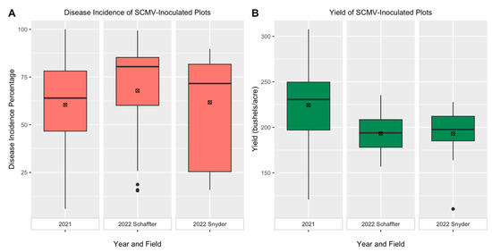 Boxplots displaying (A) the disease incidence percentage values and (B) average yield values (bushels/acre), for each of the fields and years involved in the study for the SCMV-inoculated field plots. The solid black lines inside the plots represent medians, and the X marks represent the mean for each plot.
