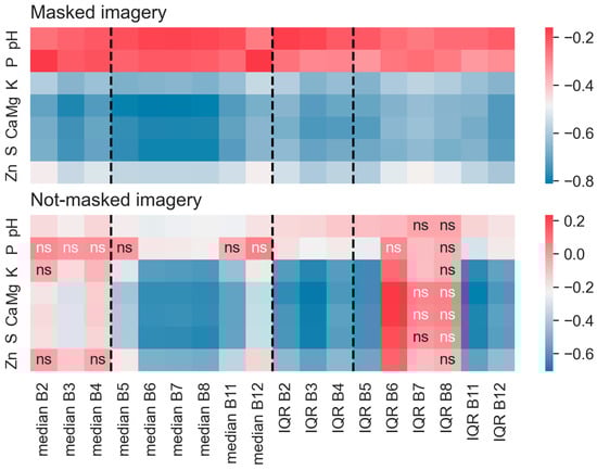 Correlation analysis between band statistics for pixels spatially coincident with soil fertility measurements. The panel showing masked imagery (top) shows a stronger correlation between measured soil variables and reflectance bands than the panel for not-masked imagery (bottom). The bottom panel likely indicates some confounding influence of vegetation in the relationship. Cells not showing “ns” indicate relationships that are statistically significant at p < 0.05. Dashed lines separate the visible bands from the infrared bands of the spectrum. The study site is in Washington County, Western Mississippi, USA.