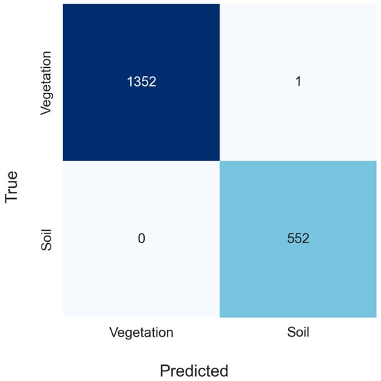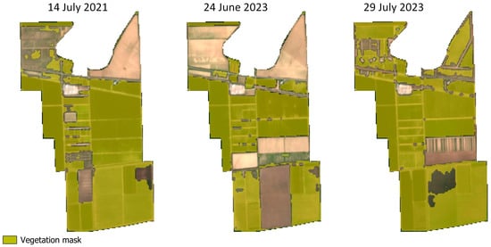 The vegetation masking algorithm implemented in GEE from the hand-selected training data was highly accurate (>99% accuracy, Figure 4). The y-axis indicates the number of observations giving the true value of the classification, while the x-axis indicates the number of observations giving the predicted value of the classification. For instance, 1352 observations were correctly predicted to be vegetation, and 1 observation was predicted to be soil when it was in fact vegetation. The remaining 1904 validation observations were correctly classified. No pixels predicted to be vegetation were found to be bare soil pixels. Seasonal changes associated with cropping patterns and changes after planting were evident after applying the vegetation masking model to the images in the Sentinel library within analyzed dates (between June and October, from 2019 to 2023) (Figure 5). The image from July 2021 shows similarities to the image from July 2023 in terms of patterns of where crops have been planted and their stages of growth and greening during the growing season, but some areas that have had bare soil are showing likely vegetation and vice versa. The vegetation masking model captures these trends. Likewise, the large change in greening from June 2023 to late July 2023 captures a quick change in vegetation cover associated with crop growth from the early to the middle parts of the growing season for the crops grown at the site.