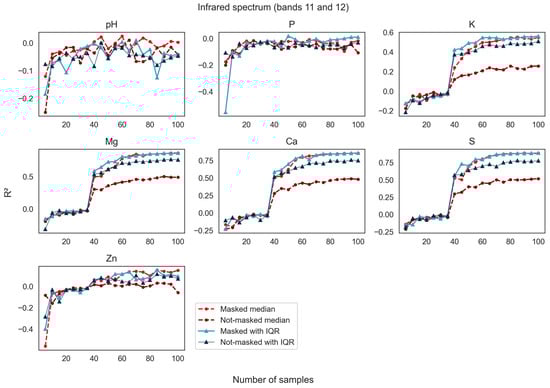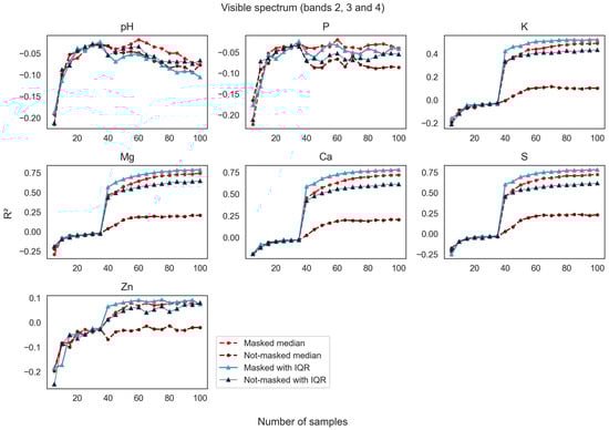 The next two figures (Figure 6 and Figure 7) show the influence of sample size on the effectiveness of models built with S2 data that underwent vegetation masking compared to models developed with not-masked S2 data. Overall, as the sample size increased to about 40 samples, model performance improved greatly for K, Mg, Ca, and S. The model improvement was greatest for the masked datasets when using only median bands or when using both median and IQR bands as explanatory variables. Models trained with not-masked median data presented the lowest performance per sample density increase, but their performance noticeably improved after IQR data was added. Still, models that used not-masked data generated less accurate predictions than their masked counterparts.