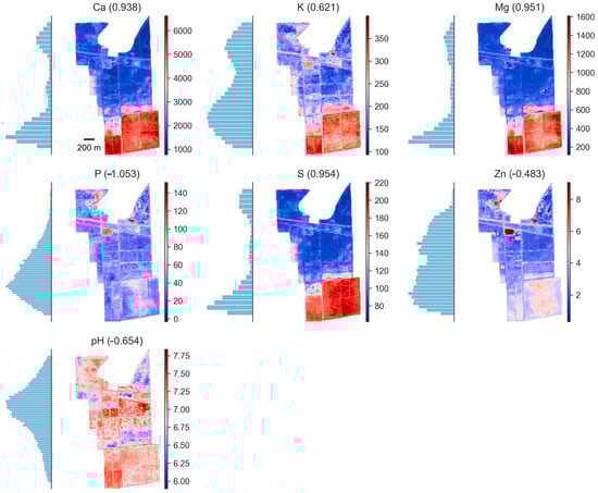 Soil fertility measurements of the 2145 soil samples taken from the soil surface of the 250-hectare study site are statistically summarized in Table 1. With only a few exceptions among the samples, values for pH and concentrations of P, Mg, Ca, and Zn were well within the tolerable range for conditions for agronomic crops [] (Table 1). Concentrations of S and K, on the other hand, showed potential for deficiencies in some sample locations and the need for nutrient management strategies to correct nutrient imbalances []. Histograms of the measured soil nutrients are given in the Supplemental Materials (Figure S1).