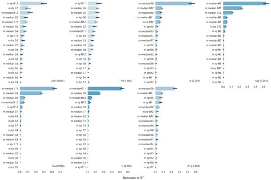 The relative importance in the models of the composite median and IQR images calculated from the time series of S2 data indicates that some bands are more useful for distinguishing soil fertility variability than others (Figure 9). The most useful bands for modeling were from the short-wave infrared range, which are also the bands that were least influenced by variability in vegetation characteristics. The models with the best fit were most strongly aided by median composite bands 11 and 8 in their ability to minimize the decrease in R2 in nutrient predictions. Median values of bands 12, 6, and 7 were also among the most important, as was the IQR of band 12.
