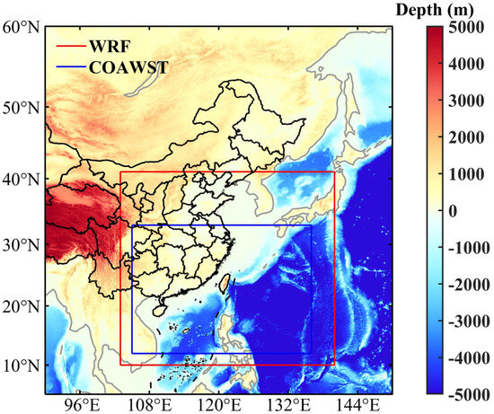 The Weather Research and Forecasting (WRF) model, developed by the National Center for Atmospheric Research (NCAR) and the National Centers for Environmental Prediction (NCEP), is widely used for typhoon-simulation studies [45]. The WRF model utilizes a structured grid and employs a time integration scheme based on either third-order or fourth-order Runge–Kutta methods. It incorporates an orthogonal curvilinear grid (Arakawa C) in the horizontal direction and topographic coordinates in the vertical direction. The model is based on the fully compressible non-hydrostatic Euler equations. The main grid of WRF spans from 103°E to 140°E and 10°N to 41°N, while the nested grids cover 105°E to 136°E and 12°N to 33°N, with resolutions of 30 km and 10 km, respectively, as illustrated in Figure 2.
