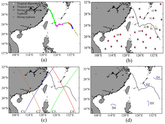 Map of the study area: (a) typhoon track and intensity; (b) location of selected Argo buoys and analysis points; (c) Jason-3 satellite altimeter track; (d) yrack of selected Drifter buoy.