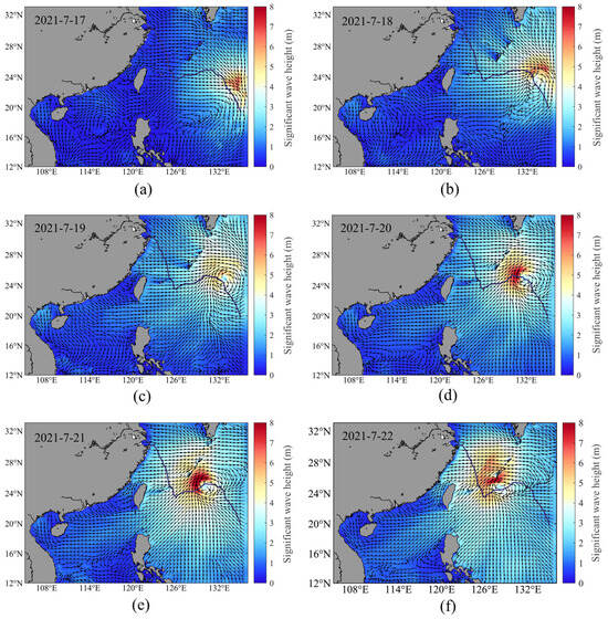 Spatial distribution of SWH during the typhoon transit (a–f) (black arrows indicate the wave direction, and colors indicate the SWH intensity).