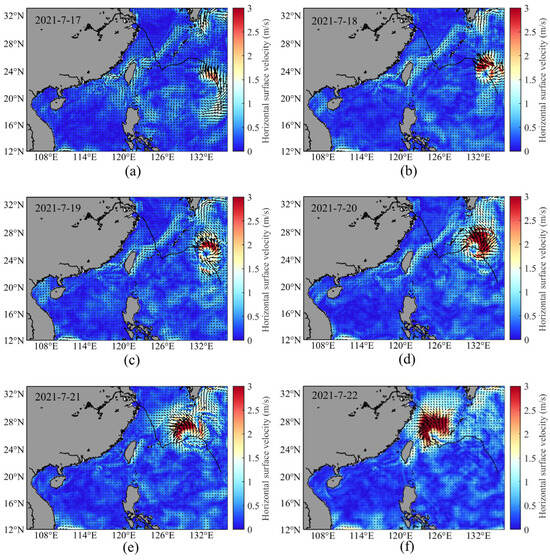 Spatial distribution of sea surface velocities during typhoon transit (a–f).