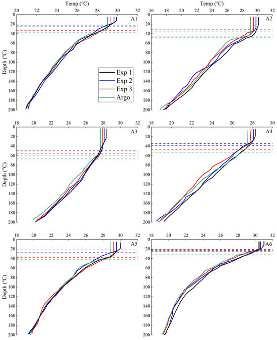 Comparison of simulated and buoy-measured temperature profiles A1–A6), and the dashed line is the depth of the mixed layer under this experiment (following the buoy position in Figure 3d).