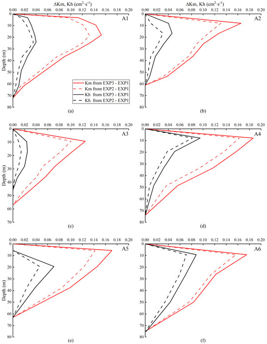 Figure 10 illustrates that mixing increases significantly during the passage of a typhoon when considering the vertical mixing effect. The mixing intensity is greater near the typhoon than farther away from it. The coefficients of the vertical mixing depths from the six buoys are limited to 80 m. At buoy A3, which is farther from the typhoon, the Km and Kh are smaller than those near the typhoon. However, after adding the vertical mixing effect, the Km and Kh increase significantly, showing that wave-induced mixing is notably strengthened. At buoy A5, also farther from the typhoon, the mixing degree does not deepen without adding the vertical mixing effect to the model. However, after adding the wave effect, the mixing coefficients increase significantly, although the vertical mixing depth is limited to 60 m. This may be because during the passage of Typhoon In-Fa, buoy A5 in the South China Sea was far from the typhoon’s center. The waves generated by the typhoon traveled a path with more islands, dissipating most of the energy. The vertical mixing depth is thus deepened, and the mixing effect may control the formation of the thermocline to some extent, resulting in more homogeneous mixing of the upper ocean.