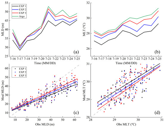 MLD, MLT time series plots of Argo observations versus two experiments (a,b). Scatter plots of buoy observations of MLD and MLT versus model results and the associated linear best-fit lines (c,d). Observations were taken from buoys that were within the typhoon’s influence during the typhoon (locations of buoys are shown in Figure 3d).