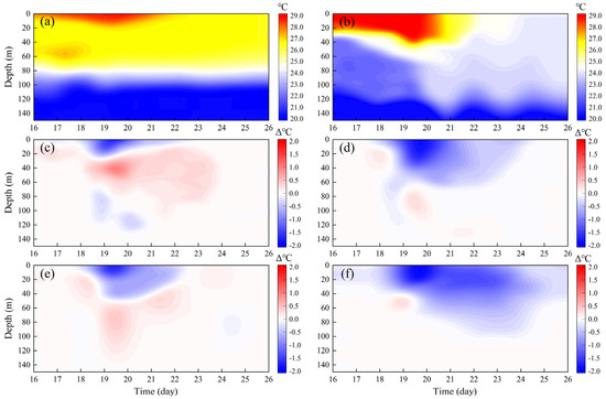 For the left side of the typhoon (Figure 12c,e), the temperature difference between the shallow and deep waters before the transit is small, indicating that the wave-induced mixing effect does not have much effect on the seawater temperature. During the typhoon’s transit, the temperature difference in the shallow water column (e.g., 0–50 m) began to increase, indicating that cold water rises from the deeper layers resulting in cooling of the shallow layers, but the temperature of the deeper water column did not change much. After the passage of the typhoon, the temperature difference in the shallow water column gradually decreased, the temperature began to recover, the influence of wave-induced mixing effect weakened and the temperature change in the deep water column remained small. In contrast, on the right side of the typhoon (Figure 12d,f), the temperature difference between the shallow and deep water bodies before the transit was also smaller. During the typhoon’s transit, the temperature difference in the shallow water column increased significantly, indicating significant cooling due to wave-induced mixing effects, and the temperature difference in the deeper water column also began to increase, showing that the rise of deeper, colder water affected the deeper water column. After the crossing, the temperature difference in the shallow water body gradually decreased, but the recovery was slower than that on the left side, indicating that the wave mixing effect on the right side of the typhoon was stronger and lasted longer than that on the left side, and that the temperature difference in the deeper water body was also gradually decreasing but recovering more slowly.