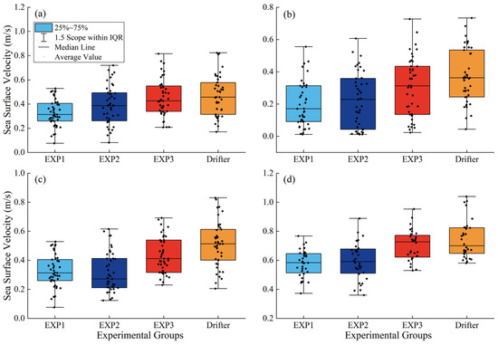 The dynamics during a typhoon are complex. Previous studies have demonstrated that the wave-induced mixing effect (one of the wave-induced stress terms) alters the distribution of surface currents, which in turn affects the energy conservation equation and subsequently influences SST [59]. Figure 13 compares the outputs of the three experiments with the measurements from selected drifter buoys. The results indicate that SST values from EXP3 are higher than those from EXP1 and EXP2 and are closer to the measured values from the drifter buoys. Overall, incorporating the wave mixing effect into the COAWST model results in increased sea surface current velocities and decreased SST. This is because the wave mixing effect enhances turbulent mixing and momentum transfer in the near-surface layer. Wave breaking injects momentum into the ocean’s surface layer, increasing surface turbulence and causing momentum to be transported from the lower water column to the upper layer, thereby increasing sea surface current velocity. Simultaneously, this enhanced turbulent mixing causes cold water to rise from deeper layers and heat to diffuse downward, resulting in a decrease in sea surface temperature.