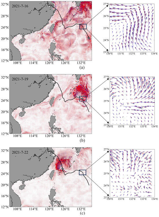 Surface flow vector fields (a–c) before, during, and after the typhoon (green asterisks indicate the location of the typhoon, black arrows indicate results for EXP1, blue arrows indicate results for EXP2 and red arrows indicate results for EXP3).