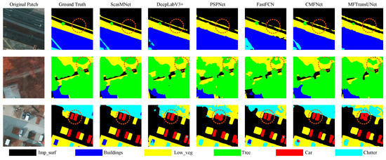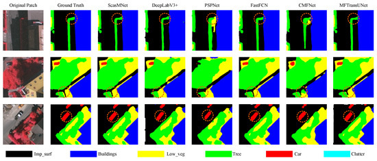 Figure 6. Most of the pixels in the first row of patches belong to either impervious surfaces (labeled in black) or buildings (labeled in blue). It can be seen that our proposed method correctly segmented the edges and contours of these two classes with almost no misclassification. As for the other five methods, all of them have some misclassification. Most of the pixels in the second row of the patch belong to the “tree” class (labeled in green) or the “low vegetation” class (labeled in yellow). Our proposed ScasMNet’s performance is the best, almost the same as the ground truth. For example, FastFCN and MFTransUNet do not segment the trees in the upper right corner correctly, while the misclassification of CMFNet is also obvious. The third row of paths covers cars, which are densely distributed and small. Our method also correctly segmented the targets, checking the places marked by circles in each patch. In summary, the qualitative visualization and quantitative results remain completely consistent.