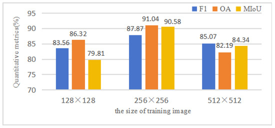 Figure 8, it can be seen that when the training samples are cropped to 256 × 256, the highest values for OA, F1, and MIoU are obtained. In contrast, when cropping to 128 × 128 or 512 × 512, the evaluation metrics did not improve but decreased. Consequently, in all experiments conducted throughout this paper, we randomly and repetitively crop the original image to a size of 256 × 256.