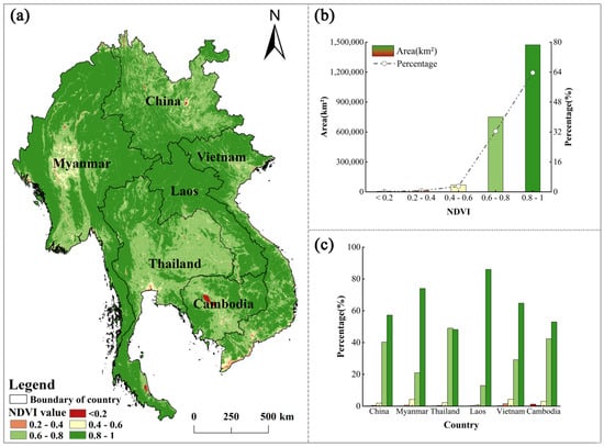 Spatial variation of NDVI in different countries in the GMS. (a) Map showing NDVI spatial variation across the GMS, (b) plot showing trends in NDVI changes across different countries, and (c) plot showing percentage change in NDVI across different countries.