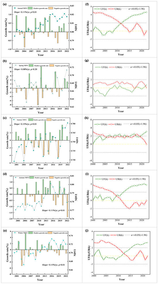 Plots showing temporal variations in NDVI from 2000 to 2022: (a) interannual, (b) spring, (c) summer, (d) autumn, and (e) winter. Plots showing Mann–Kendall mutation test results from 2000 to 2022: (f) interannual, (g) spring, (h) summer, (i) autumn, and (j) winter.