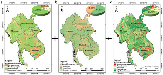 Maps showing the spatial distribution of vegetation change trends in the GMS: (a) Sen’s slope estimation, (b) Mann–Kendall significance test, and (c) Sen-MK trend-coupling type.