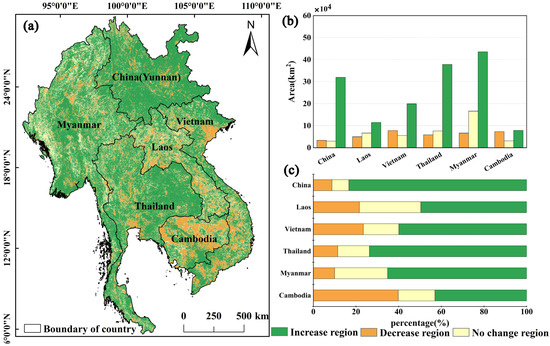 To illustrate the evolutionary trends in NDVI dynamics in the GMS countries from 2000 to 2022, we classified the results into three types: increasing regions, regions of no change, and decreasing regions (Figure 6a). In general, our research results show that vegetation cover changes in the GMS countries are increasing (Figure 6c). Specifically, the overall vegetation cover in China’s Yunnan Province increased significantly during the study period, with 83.38% of the total area of Yunnan Province showing an increase in vegetation cover. Only 8.73% of the Yunnan Province by area exhibited decreased vegetation cover, with these areas mainly distributed in the central part of the province (Figure 6a). The vegetation dynamics trends in Myanmar and Thailand are similar to those in China, with the percentage of increasing vegetation coverage accounting for 65.18% and 73.72% of each country’s total area, respectively. In addition, the vegetation cover in Laos and Vietnam also exhibited an improving trend, with 49.67% and 59.94% of these countries by area undergoing vegetation increases, respectively. Notably, the area percentages of increased and decreased vegetation cover in Cambodia do not differ markedly, accounting for 43.04% and 39.82% of this country, respectively.