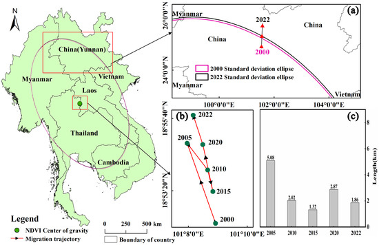 Trends in NDVI center of gravity migration in the GMS for the period 2000–2022. (a) Standard deviation ellipse, (b) center of gravity migration trajectory, and (c) interannual migration distance.