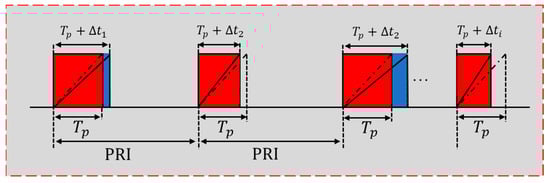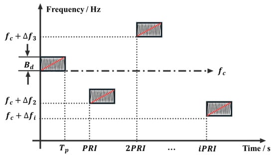 Frequency Agile Linear Frequency Modulation Signal (FA-LFM) is achieved by randomly increasing or decreasing the carrier frequency of each pulse within the hardware’s allowable range, while maintaining a fixed bandwidth. In principle, this can enhance the radar’s anti-jamming capability. A schematic diagram of the transmitted signal waveform is shown in Figure 2.