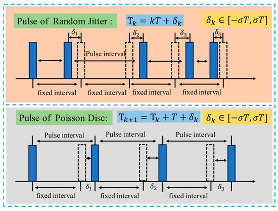 The random agility of the pulse repetition frequency (PRF) makes it difficult for jammers to generate fully coherent jamming signals, leading to misalignment in the azimuth direction and resulting in the failure of two-dimensional focusing to some extent. There are two main methods of PRF agility: random pulse jitter and Poisson disk pulse, with their interval patterns shown in Figure 4.