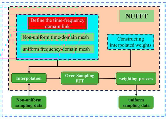 The choice of interpolation function directly impacts the efficiency of the final result, and typically, an approximate solution is considered sufficient. Let . By substituting the interpolated signal into the first equation, we obtain Equation (7), which completes the time–frequency transformation from non-uniformly sampled signals to uniformly sampled signals: