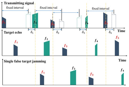 As shown in Figure 8, due to the longer sampling time of a single false target jamming and the increased difficulty for the jammer to analyze the multi-parameter agile waveform and frequency diversity, the jammer’s transmitted signal has a time delay. Therefore, the retransmitted jamming generally lags by one pulse. By utilizing this jamming delay, it is possible to distinguish between real targets and false targets during the phase compensation process of parameter agility.