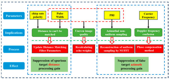 Different agile parameters have varying impacts on imaging, requiring distinct processing methods. In terms of suppressing active jamming signals, pulse width and chirp rate primarily suppress jamming signal energy in the range dimension, while carrier frequency and PRI mainly function in the azimuth dimension. By applying random agility to these parameters, active jamming signals can be effectively suppressed from different dimensions, thereby enhancing the anti-jamming capability of radar imaging. Pulse width agility disrupts the energy distribution of the jamming signal by altering the time-domain characteristics of the echo signal [19]. Chirp rate agility changes the frequency-domain characteristics of the signal, preventing the jamming signal from maintaining consistency in the range dimension [20].