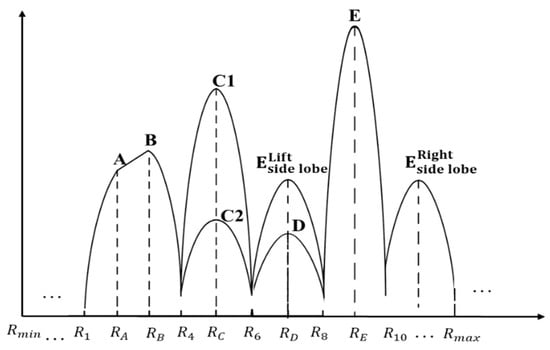 The compensation matrix constructed using the range axis is also applicable to multi-target situations. In real SAR imaging scenarios, multiple strong and weak target echoes are often present in the same echo segment, as shown in Figure 13. The main lobes of targets A and B are separated by adjacent sampling points; targets C1 and C2 are overlapped at one sampling point; targets D and E are separated by different sampling points, with E’ being the first side lobe of target E and D being a weak target adjacent to E. In such cases, the range axis compensation matrix can achieve accurate compensation for the main lobes of each target and naturally suppress the side lobe effects, ensuring imaging quality in multi-target scenarios.