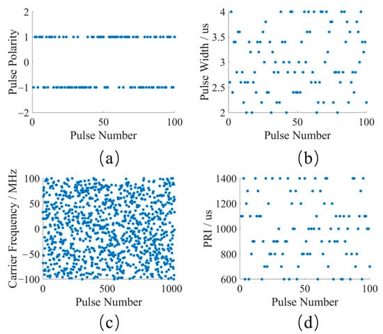 Reducing transmission power often leads to a decline in radar performance, while eliminating interference signals through back-end signal processing can easily cause echo signal distortion and incomplete interference suppression [11,12]. With the maturity of waveform generation technology and advancements in hardware equipment, active anti-jamming methods based on waveform design have gradually become a research hotspot [13,14]. Among these methods, using complex waveforms generated by random agility of inter-pulse parameters can effectively reduce the probability of interception and actively suppress active deceptive signals [15,16,17]. Traditional LFM signals primarily include parameters such as pulse width, bandwidth, chirp rate, carrier frequency, and PRI. To ensure consistent range resolution, the bandwidth is typically not altered. Therefore, on the basis of fixed parameters, random agility is applied within a certain range to the pulse width, chirp rate, carrier frequency, and PRI. This randomness disrupts the timing of the jamming receiver, increasing the difficulty of analysis. As a result, the retransmitted jamming signals cannot match the time sequence of the original pulses during processing, thereby actively suppressing the imaging of deceptive targets [18].