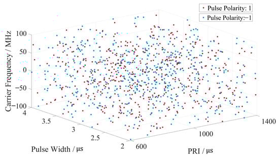 By ensuring a constant bandwidth, agility is achieved during each pulse transmission by randomly generating a set of values for pulse width, chirp rate, and carrier frequency parameters. The agility of the PRI is realized by varying the pulse transmission times; a multi-parameter joint agile waveform schematic diagram is shown in Figure 1. Each pulse signal is spaced at a fixed interval with an additional random jitter of σ, resulting in different PRF for each pulse. The signal polarity is represented using different colors.