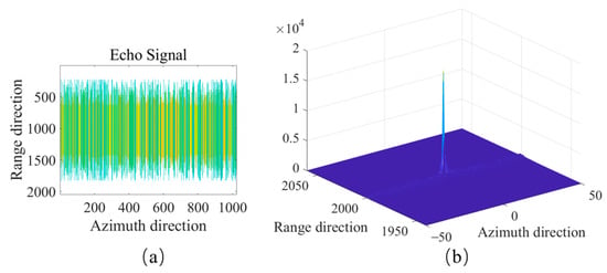 The baseband signal of a single pulse echo can be represented as Equation (1). In this context, represents the fast time in the range direction andrepresents the slow time in the azimuth direction. Assuming that the carrier frequency, frequency modulation polarity, pulse width, and pulse repetition period vary with the continuous pulse interval. On the right side of the equation, is an arbitrary constant, is the range envelope, represents the time width of a single pulse, is the azimuth envelope, and is the standard carrier frequency. The carrier frequency is randomly shifted between pulses through ; is the randomly assigned frequency modulation polarity, taking values of 1 and −1. is the corresponding frequency modulation polarity, which also varies with the pulses.