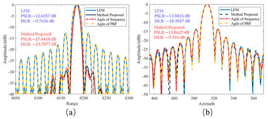As shown in Table 4, the effect of azimuth compression processing is similar to that of LFM signals. However, the improved BP algorithm, when handling 200 MHz agility, results in an excessively high integrated side lobe ratio, making it unsuitable for agile frequency imaging.