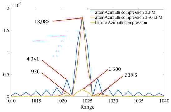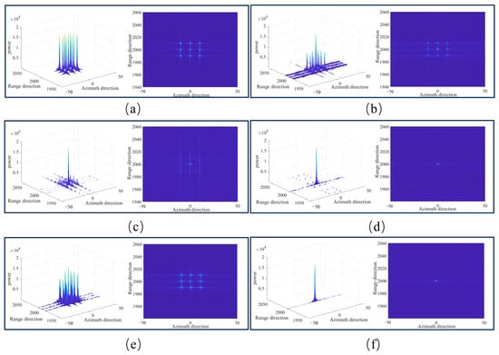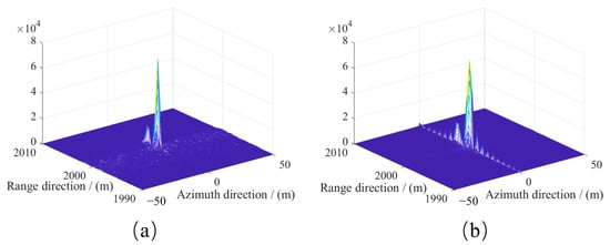 Figure 14 shows the comparison of point target focusing in the azimuth direction before and after compensation. The left side is a schematic diagram of the point target after range pulse compression, and the right side is the azimuth focusing result after compensating only the main lobe units of the target in the range direction. For traditional LFM signals, when azimuth compression is performed on the main and side lobes after range pulse compression, the gain enhancement is consistent, so it does not affect the range compression. This paper improves the range imaging metrics by selectively and accurately compensating the main lobe of the target in the range direction. The side lobes of the target, due to the sampling point offset, have significant compensation errors. As a result, the main lobe energy is fully focused in the azimuth direction, while the side lobe energy remains defocused in the azimuth direction.