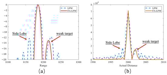 Imaging Comparison of LFM and FA-LFM for Adjacent Strong and Weak Targets in Range Direction: (a) Normalized Range Comparison Chart; (b) Actual Range Energy Diagram.