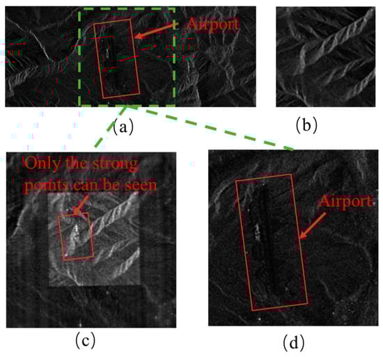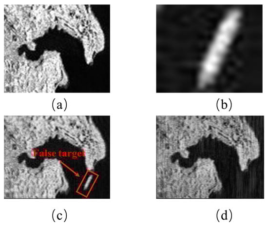 The imaging results of two kinds of signals in the face of deception interference of large scene interference: (a) Target Scene; (b) Jamming Template; (c) LFM Signal Imaging Result; (d) Multi-Parameter Joint Agile Signal Imaging Result Under the Proposed Processing Flow.