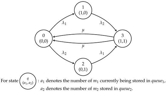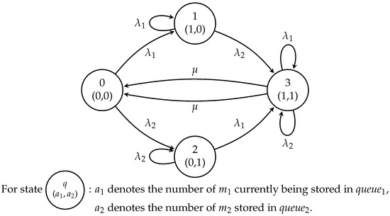LCFS with preemption in waiting (LCFS-PW): Under the LCFS-PW queuing discipline, queuei has two storage positions and is preemptive. The new arriving packets are only allowed to preempt packets in waiting. In this paper, for a new arriving , if , or , or , the management of the packet under LCFS-PW is the same as the LCFS-PS one. If or , the new enters queue1. If or , the new preempts the old one stored in the second position of queue1 and the old one is discarded. For a new arriving , it is similar to the above.