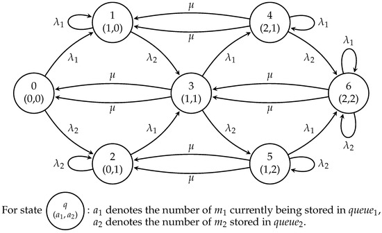 Define tuple , where denotes the number of currently being stored in queue1, and denotes the number of stored in queue2. In the following, the three adopted queuing disciplines are described: